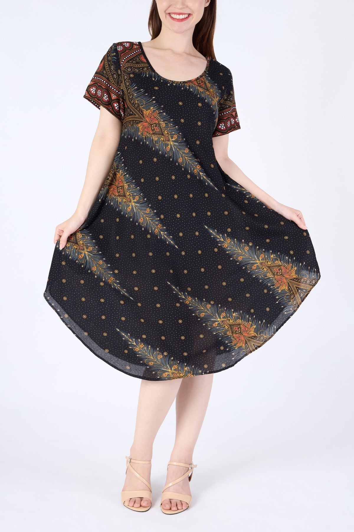 Black Peacock Fabric Dress with Sleeves and Two Pockets
