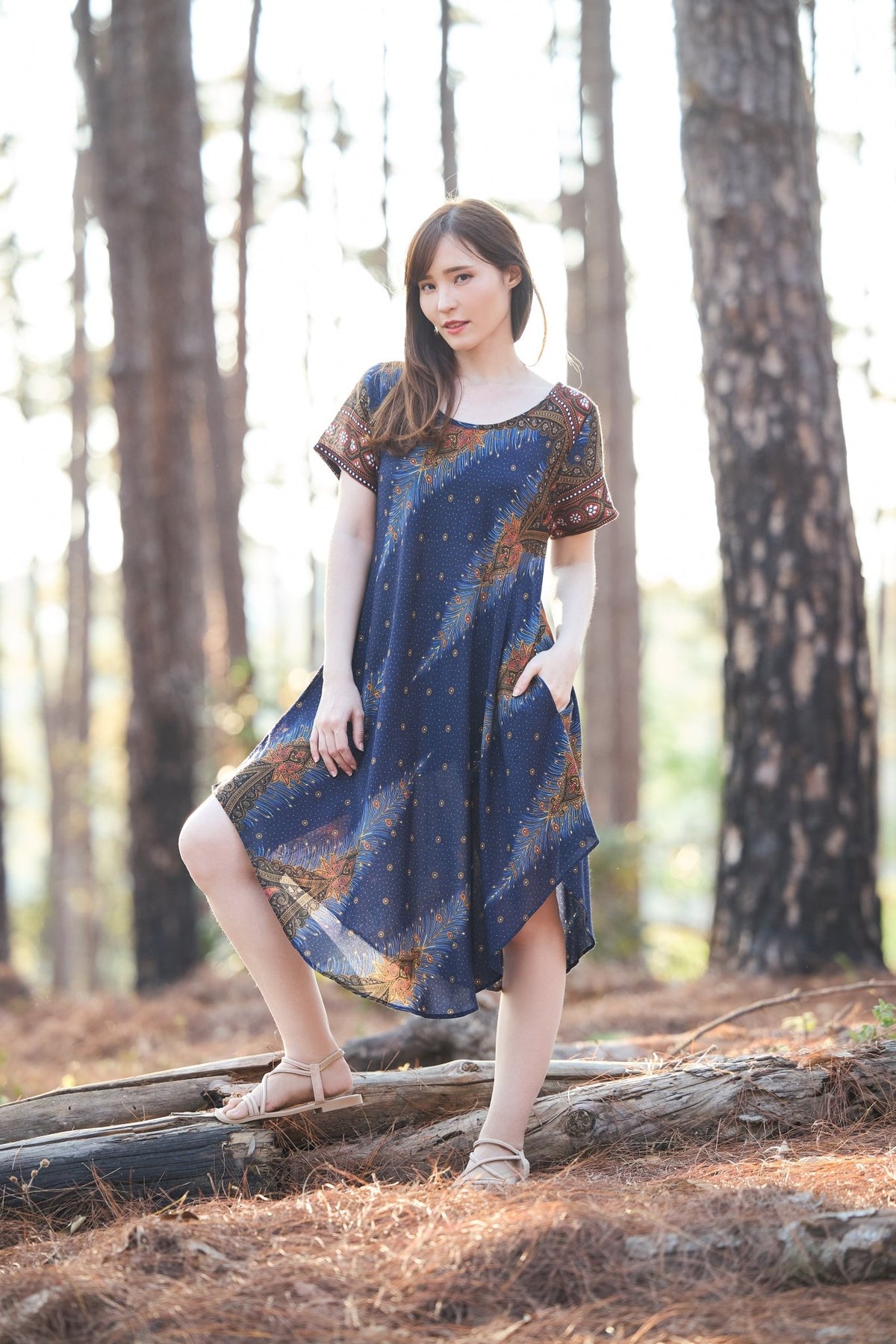 Dark Blue Peacock Fabric Dress with Sleeves and Two Pockets - Lannaclothesdesign Shop