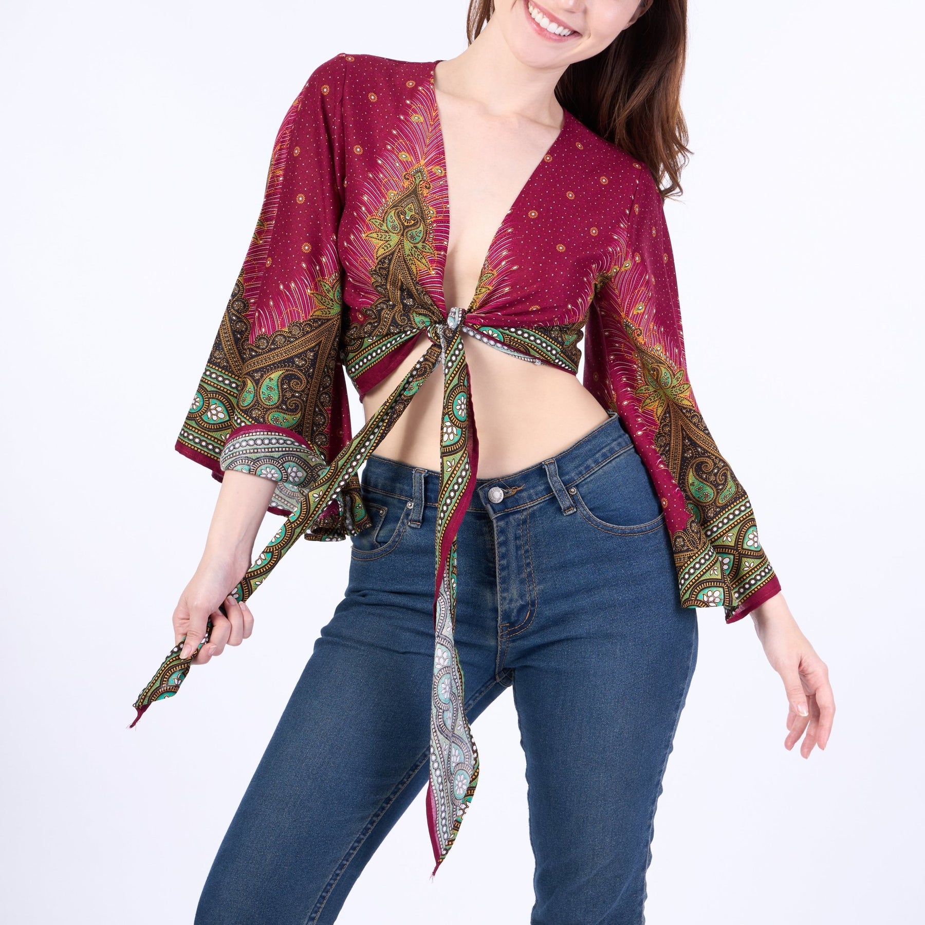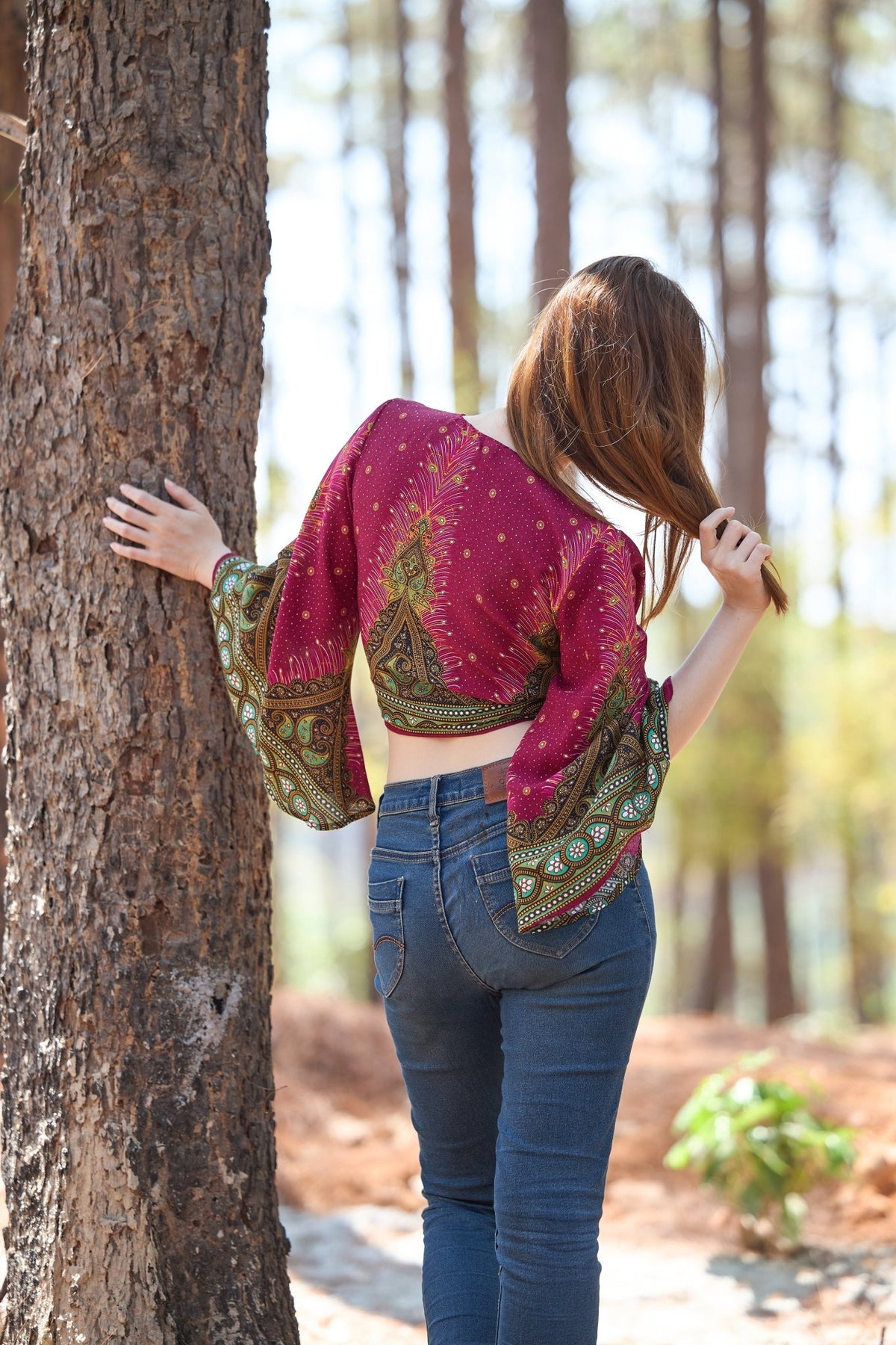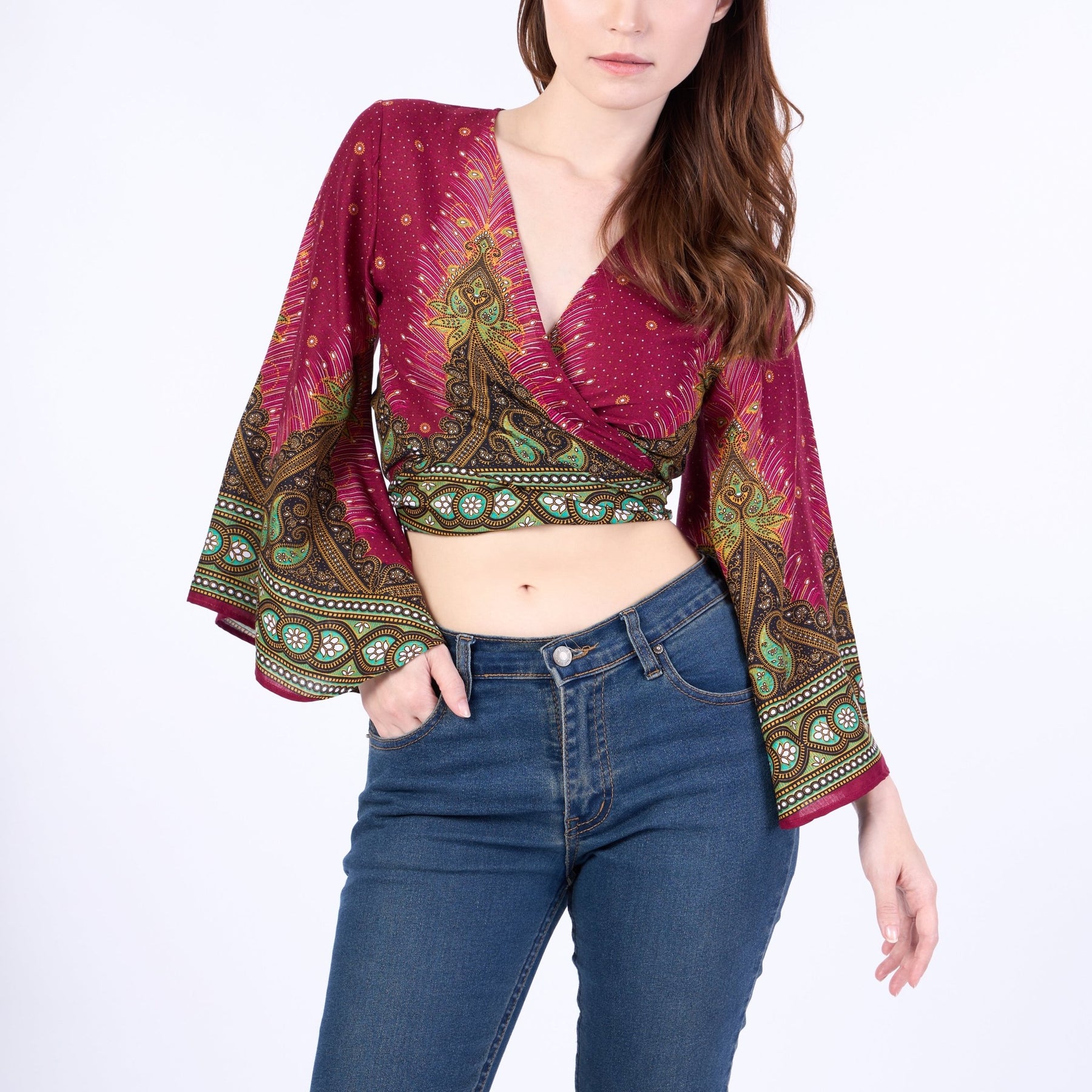 Peacock Women Boho Wrap Top - Casual Shirt - Burgundy - Lannaclothesdesign Shop
