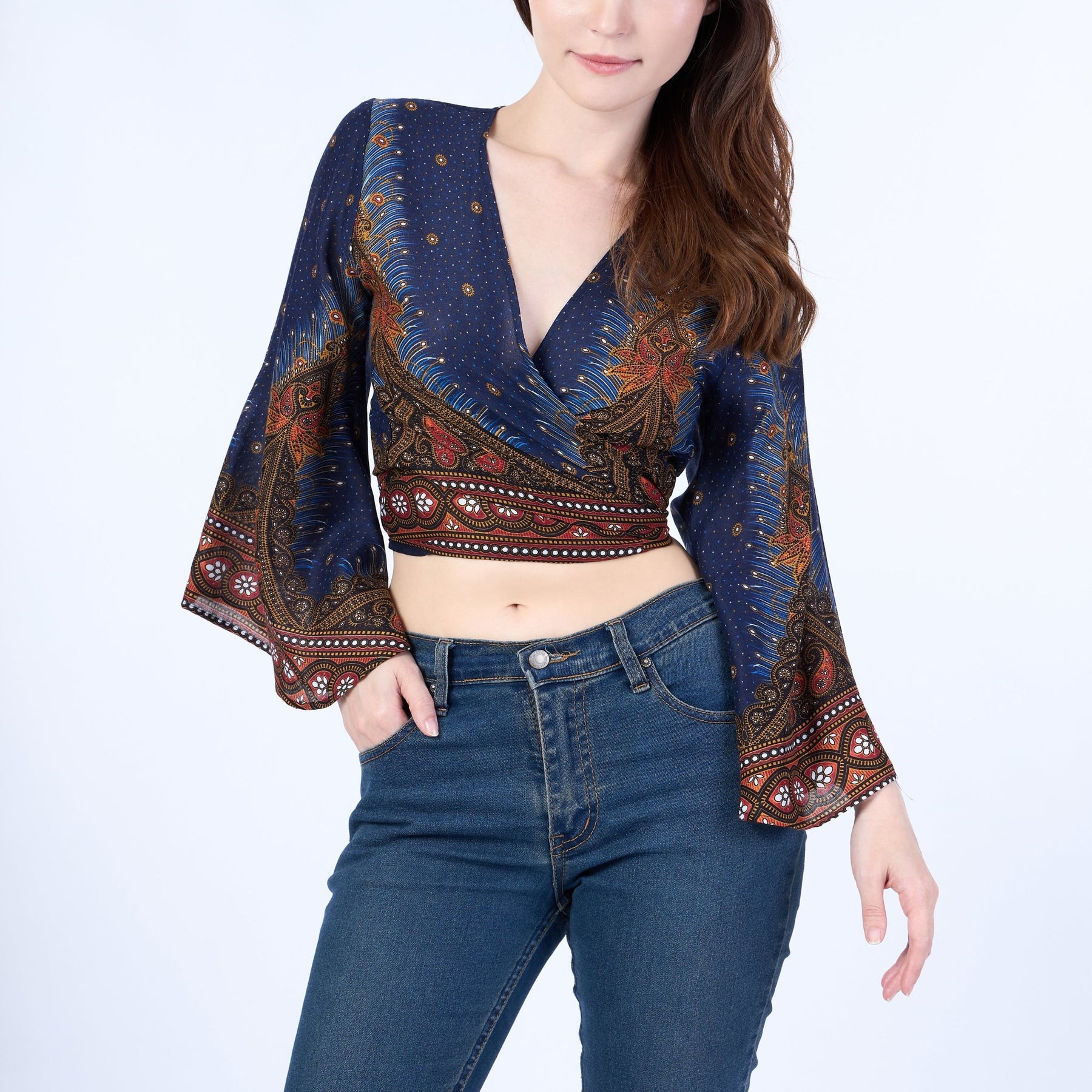 Peacock Women Boho Wrap Top - Casual Shirt - Dark Blue - Lannaclothesdesign Shop