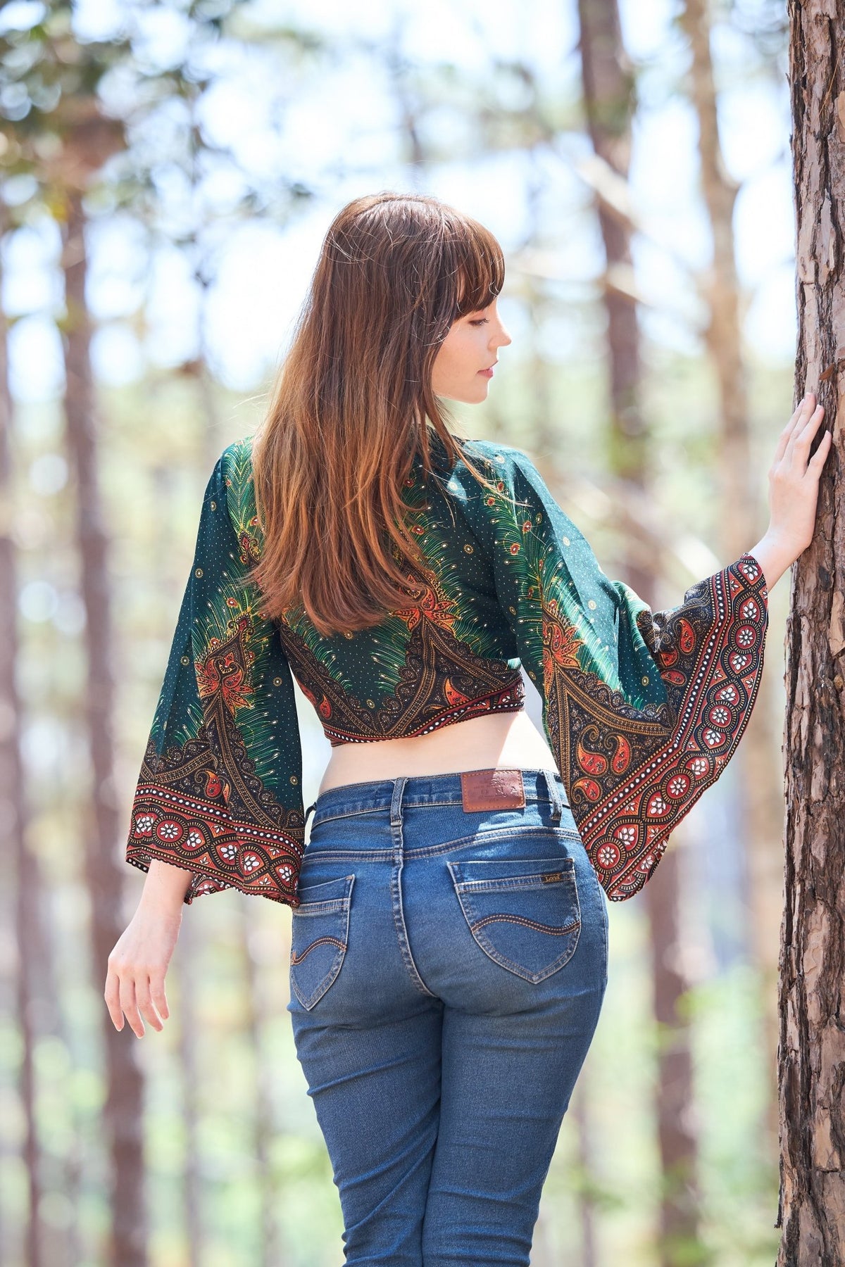 Peacock Women Boho Wrap Top - Casual Shirt - Green - Lannaclothesdesign Shop
